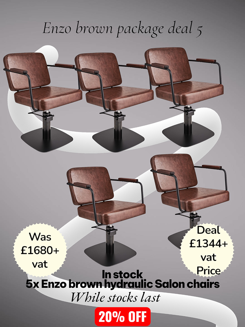 This package deal consists of x5 Enzo salon chairs, supplied by Ayala the chairs are supplied with brown upholstery and black square base. The chair is supplied boxed for ease of delivery and requires some assembling before use. Nationwide delivery can be arranged and a twelve month warranty comes as standard.