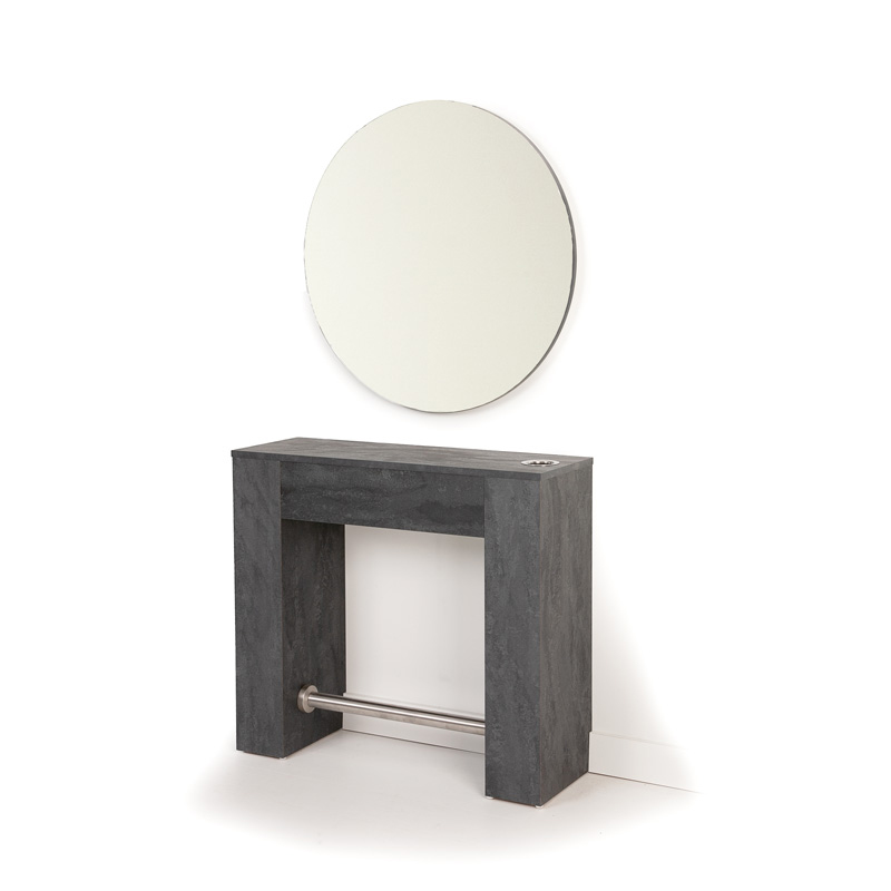 The Hove styling unit is made in the UK and is available to order in a choice of finishes and includes in the price a beautiful round polished edge mirror set on a finished and matching back board ready to fit, heavy duty stainless steel footrest and chrome dryer insert, you can also for a small additional cost have a twin 13 amp socket and backbox factory fitted to the unit to add an extra level of practicality to an already stylish and professional salon mirror.