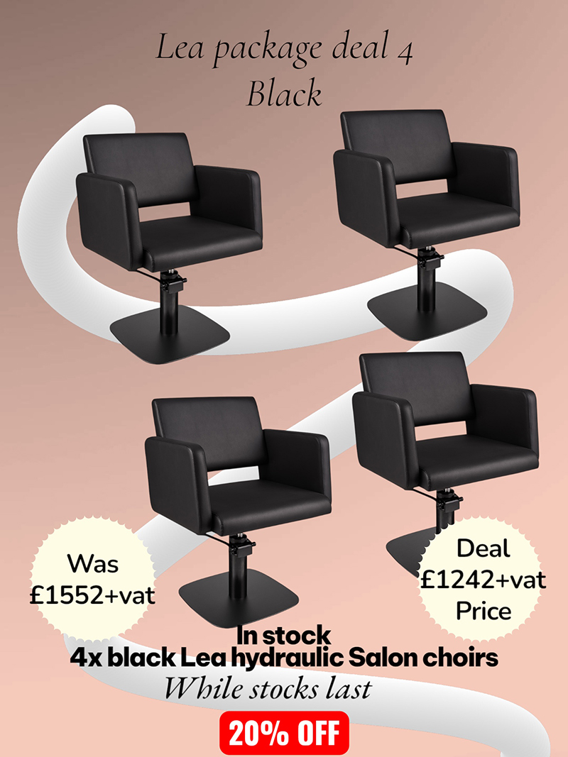 This package deal consists of x4 Lea salon chairs, supplied by Ayala the chairs are supplied with black upholstery and black square base. The chair is supplied boxed for ease of delivery and requires some assembling before use. Nationwide delivery can be arranged and a twelve month warranty comes as standard.